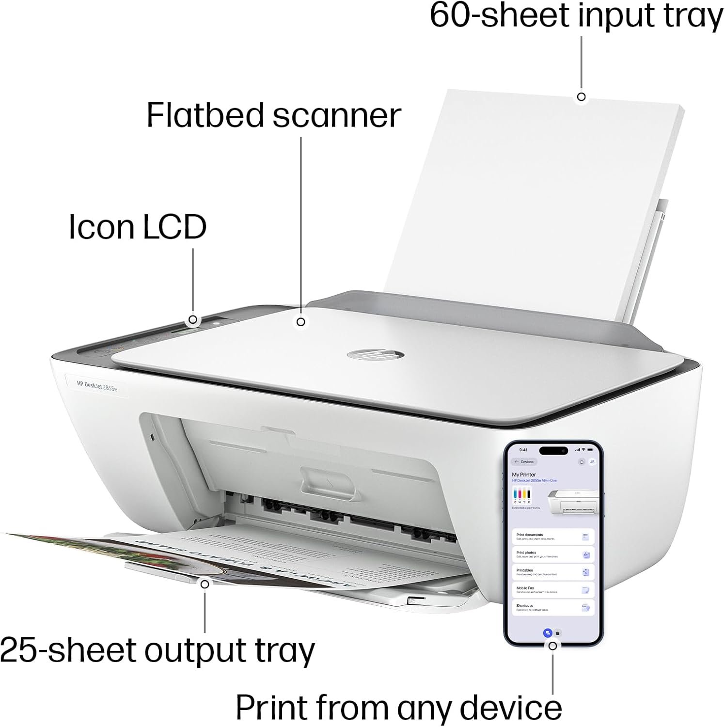 - The DeskJet 2855e is perfect for homes printing to-do lists, letters, financial documents and recipes. Print speeds up to 5.5 ppm color, 7.5 ppm black