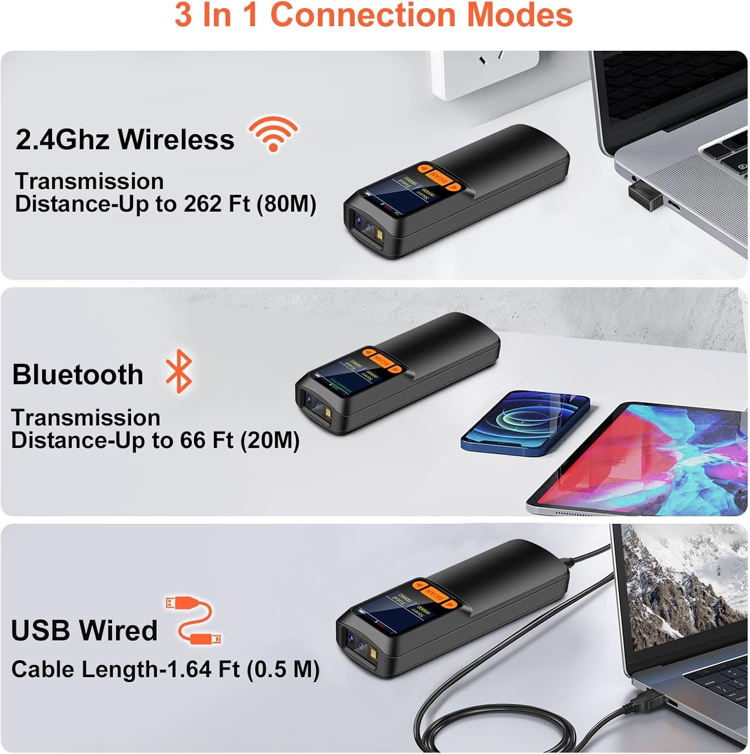 - 🔋Bluetooth/Wireless + 2000mAh Larger Capacity Battery: Continuous working for 6-7 hours (Scanning every 5 seconds) after full charge, Meet more application scenarios. KUIIYER Mini Barcode Scanner can directly connect with PC/ POS by 2.4Ghz Wireless USB or USB cable, No drive/ software needed. Compatible with Computers’ Windows, Macos, Linux and universal POS systems (▲Not Compatible with Square POS system). Bluetooth Connection will support for iPad, iPhone, Android, Tablet etc.
