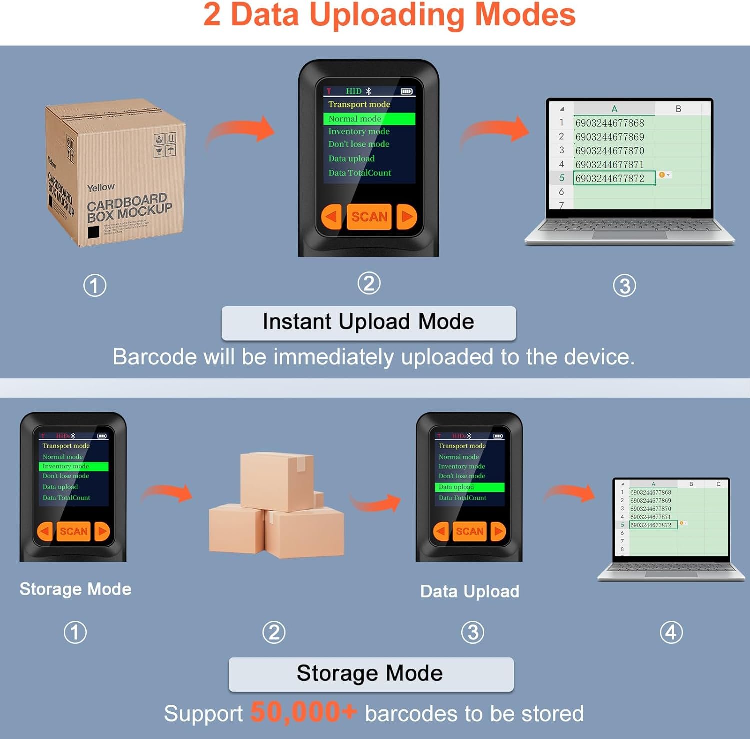 - 💡3 Scanning Modes + 2 Data Uploading Modes & Built-in Auxiliary Light: ❶Setting 3 scanning modes through the user manual, 1. Manual Trigger Mode, 2. Auto-sensing Scan Mode, 3. Continuous Scan Mode. ❷In addition to the normal mode of instant upload, KUIIYER Mini Barcode Scanner is equipped with the Inventory mode for storing over 50,000 barcodes. ❸Built-in Auxiliary Light can be used in different lighting environments, Highly applicable.