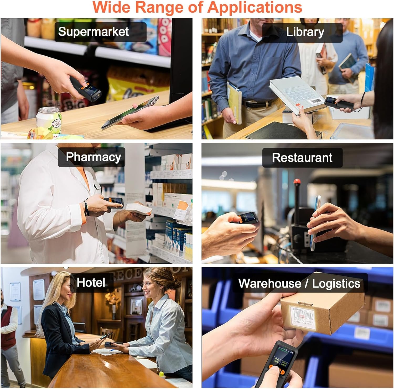 - ⭐Excellent Scanning Performance & Wide Applications: KUIIYER Wireless Barcode Scanner NOT ONLY can read the normal 1D Codes (UPC/ EAN, Code-128 and More), 2D Codes (QR, Data Matrix and More), BUT ALSO can read the complex barcodes, like wider scanning ranges, fuzzy, damaged, curved, screen, colorful code and more. And wide applications in Bookstore/ Library, Supermarket, Warehouse and Logistics, Pharmacy, Restaurant, Hotel, Banking and more fields.