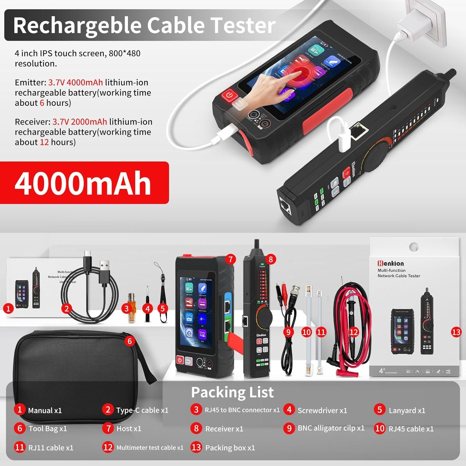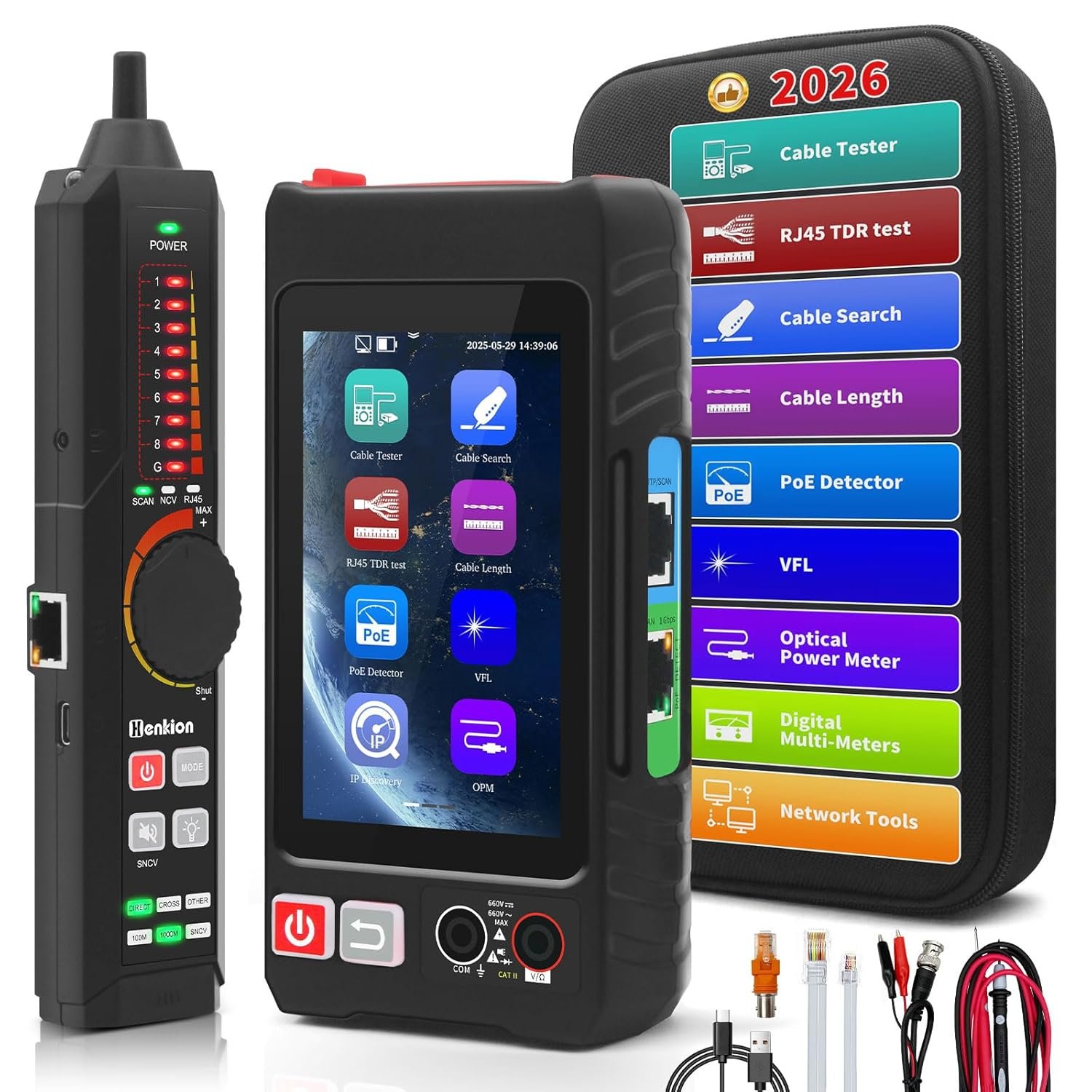 This tool combines Ethernet cable tracing, TDR measurement, digital multimeter functions, POE++ detection, and visual fault locator in a 4-inch IPS touchscreen unit. It’s designed for IT professionals and network troubleshooting.