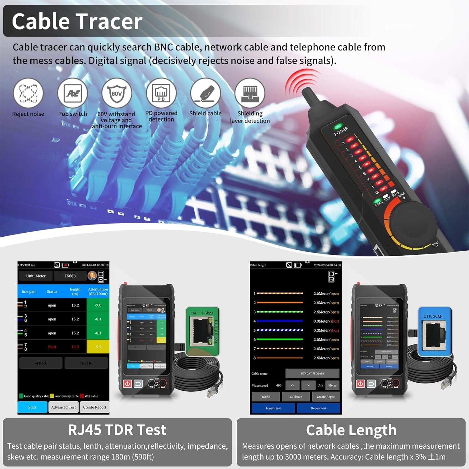 - 【RJ45 TDR Cable Test & Length Measurement】Cable tester is eaily to test cable’s pair status, length, attenuation reflectivity, impedance, skew, and other parameters. Also, you can measure opens of network cables, max measurement length up to 3000 meters. Creating test report.