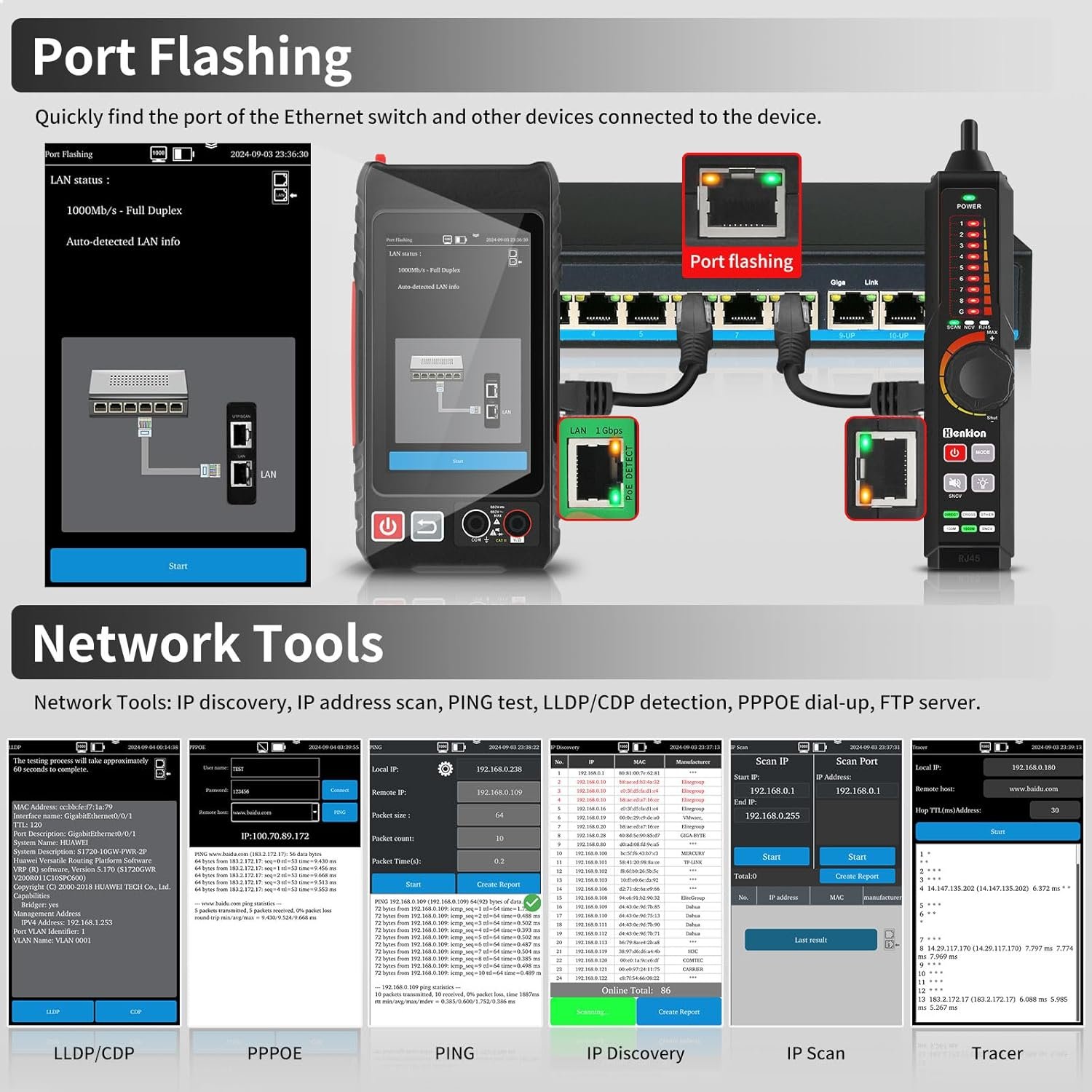 - 【POE++ Detect/Network Tools】Rj45 POE Tester supports IEEE802.3BT/AT/AF and non-standard protocol detection. Displays power supply voltage, power supply pins, and pin polarity. Furthermore, network tester built-in 1000M network port, A bunch of network tools, such as IP discovery, IP address scan, PING test, LLDP/CDP detection, Port flashing, PPPOE dial-up.
