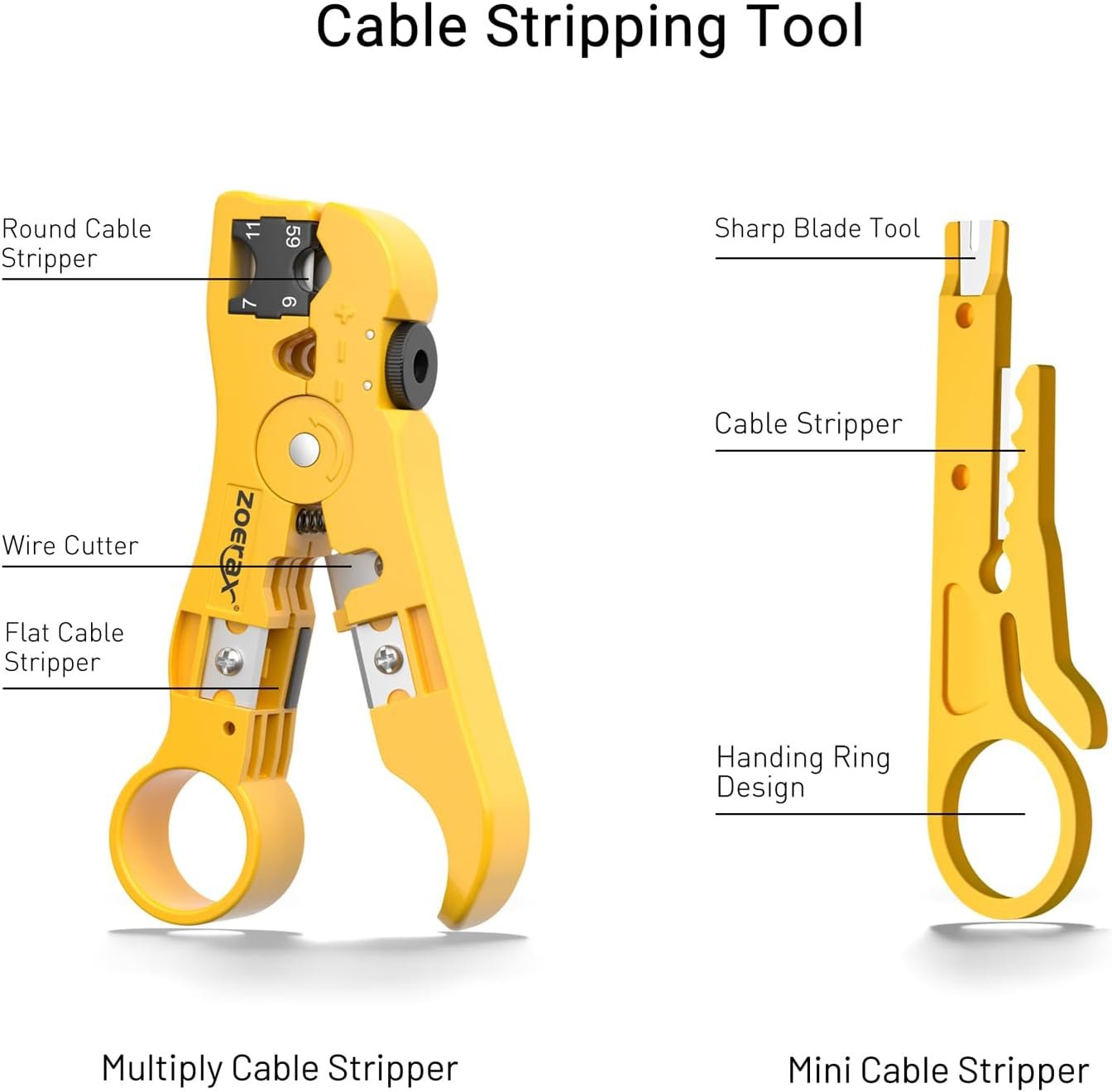 - Punch Down Tool & Stripping Suite: Features a comprehensive set of tools including a punch down tool, coaxial cable stripper, round cable stripper, cutter, and flat cable stripper, along with wire cutters for precise cable management and setup