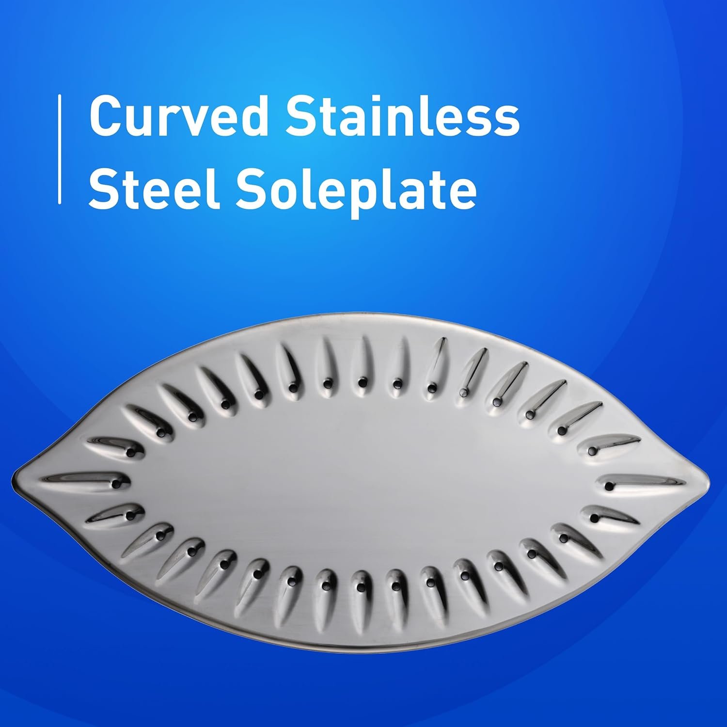 - CURVED, STAINLESS STEEL SOLEPLATE, dual-tipped soleplate maneuvers seamlessly over fabric without tugging or wrinkling