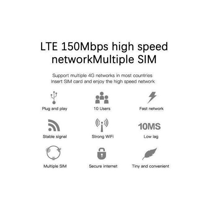 Il s’agit d’un routeur wifi 4G LTE de poche, avec batterie au lithium rechargeable intégrée, supporte 8 utilisateurs wifi, utilise une grande carte SIM (compatible avec Micro et Nano SIM).