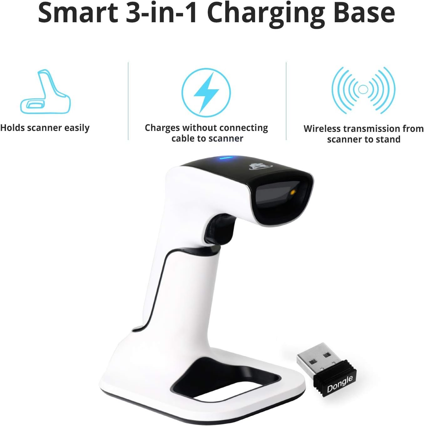 - Next Gen Smart Charging Stand: One base that can do it all. Wireless Transmission from stand to scanner. Holds scanner. Charges scanner’s built-in rechargeable Li-Ion battery via lighting connectors