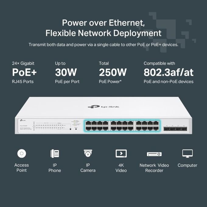 Avec un budget PoE total de 250W, ce switch peut alimenter jusqu’à 24 appareils compatibles PoE (802.3af/at) avec une puissance maximale de 30W par port. Cette capacité le rend idéal pour déployer des points d’accès WiFi, caméras IP, téléphones VoIP et autres équipements réseau sans nécessiter de prises électriques supplémentaires.