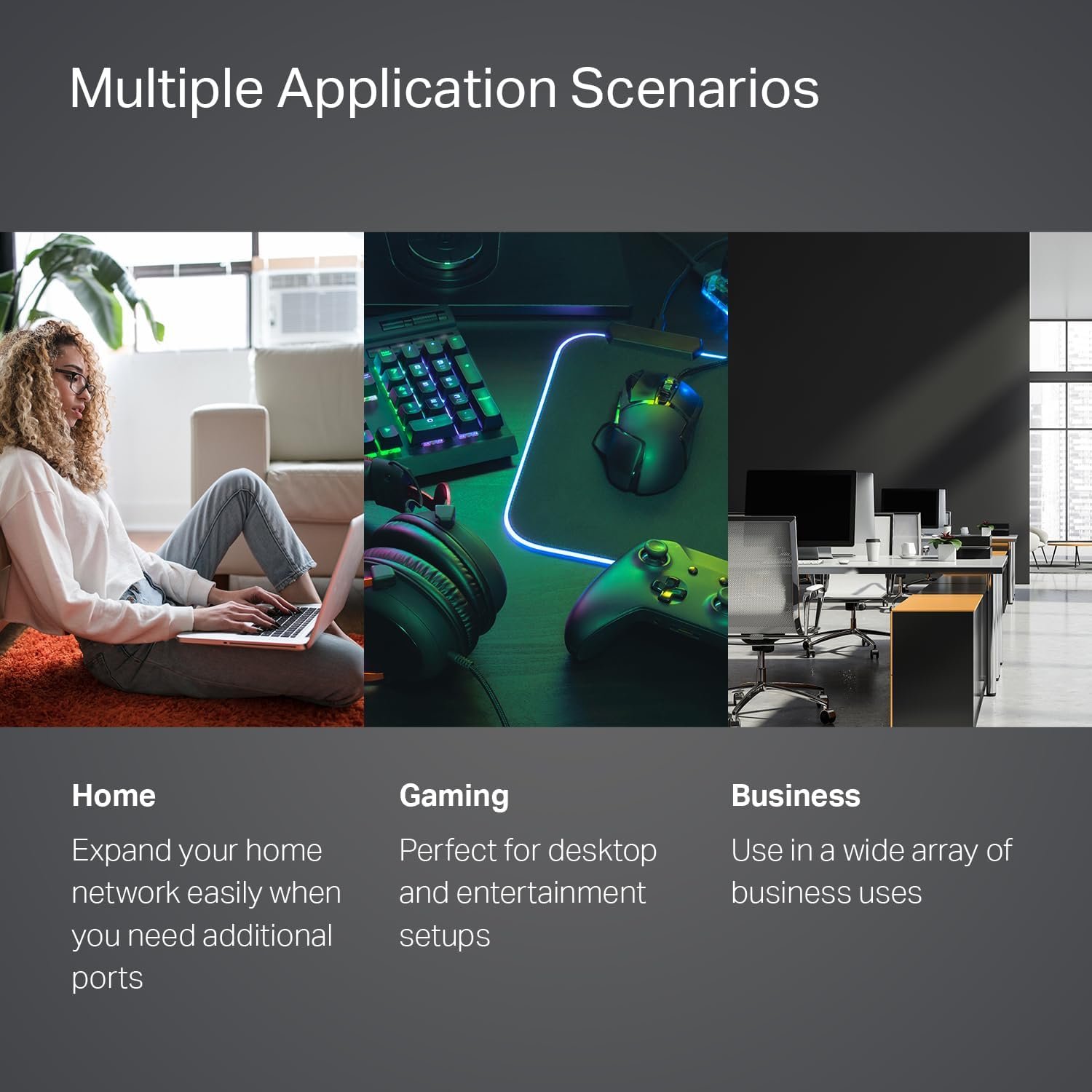 - 𝗢𝗻𝗲 𝗦𝘄𝗶𝘁𝗰𝗵 𝗠𝗮𝗱𝗲 𝘁𝗼 𝗘𝘅𝗽𝗮𝗻𝗱 𝗡𝗲𝘁𝘄𝗼𝗿𝗸: 5× 10/100/1000Mbps RJ45 Ports supporting Auto Negotiation and Auto MDI/MDIX.